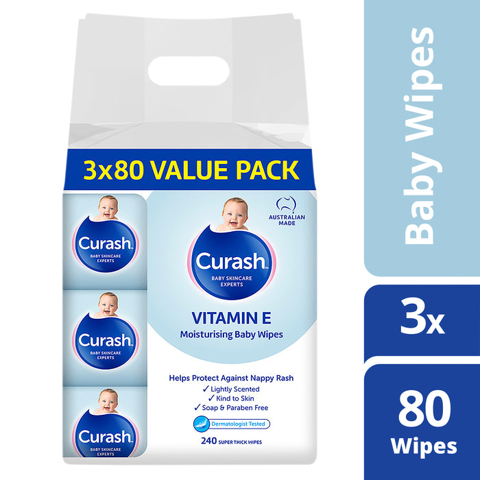 Curash Vitamin E Baby Wipes are developed with your baby’s delicate skin in mind. They are lightly scented and specially formulated to moisturise and protect baby's delicate skin.