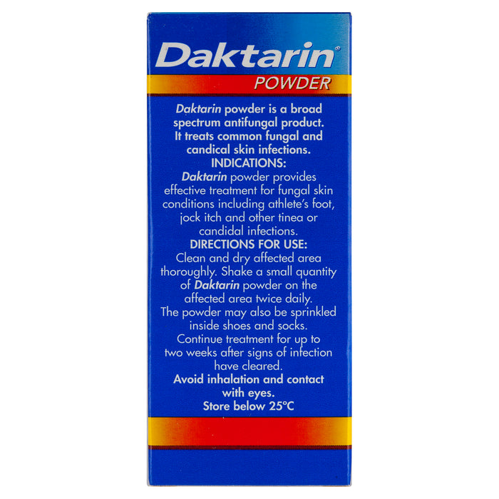 Daktarin Powder is a broad spectrum antifungal product. It treats common fungal and candidalskin infections, including athlete's foot, jock itch and tinea.