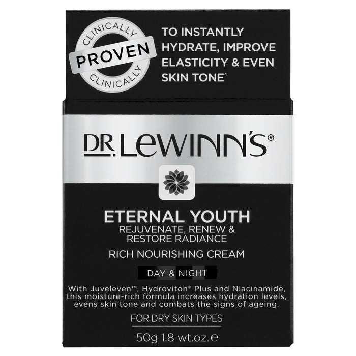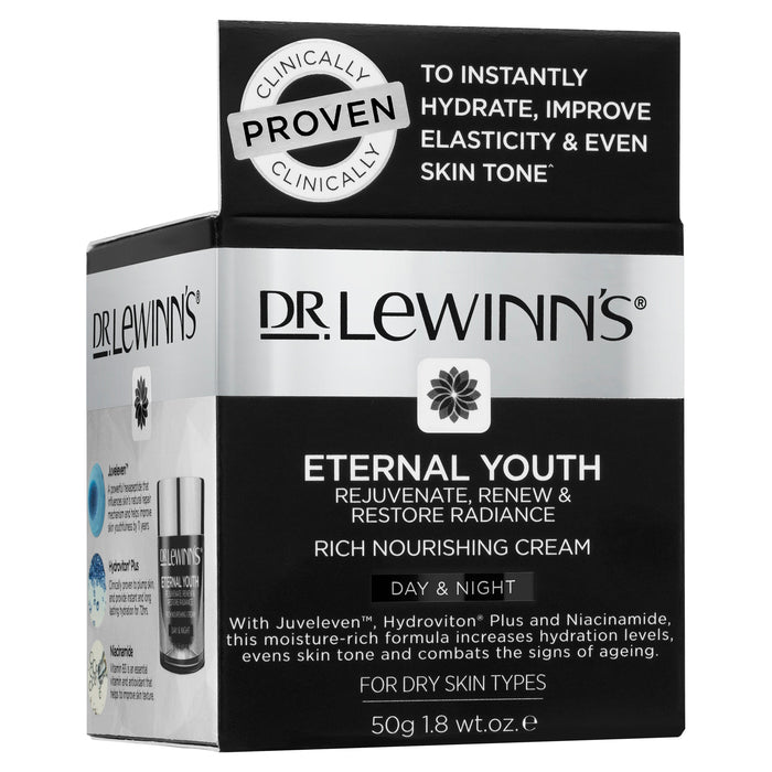 Restore and deeply nourish dry skin with the Eternal Youth Rich Nourishing Cream. A luxurious, rich cream with Juveleven™, a powerful hexapeptide that boosts the skin's natural repair mechanism, improving youthfulness by 11 years. Clinically proven Hydroviton® Plus provides instant and long-lasting hydration for 72 hours, while Hyaluronic Acid re-plumps dehydrated skin. Nourishing Shea Butter protects skin while Niacinamide improves elasticity, evens skin tone and smooths fine lines, leaving dry skin feeling and looking restored, hydrated and youthful.