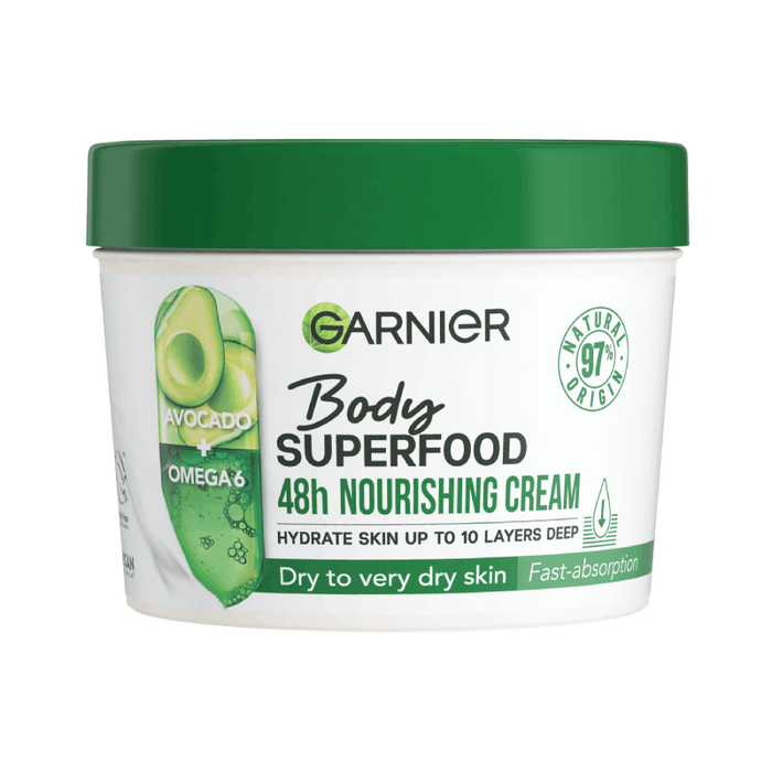 Garnier Superfood Avocado Body Cream with Omega 6 contains ingredients of 97% natural origin. This fast absorbing and rich body cream hydrates up to 10 layers deep* of the skin and provides an up to 48h nourishing effect**. For dry skin types.