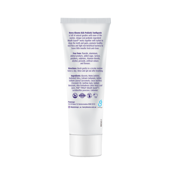 Henry Blooms Kids Probiotic Toothpaste is full of natural goodies with none of the nasties. Unique oral probiotic ingredient Dental-Lac® works together with Xylitol to clean the teeth and gums, promote healthy oral flora and fight non-beneficial bacteria to leave little mouths fresh and clean.