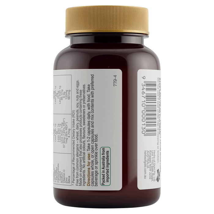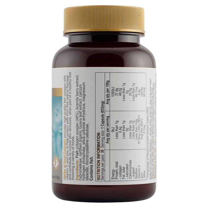 Herbs of Gold Collagen, in conjunction with antioxidant support from vitamin C and zinc, contributes to normal collagen formation for the normal function and maintenance of skin, skin structure, wound healing and normal hair and nails.