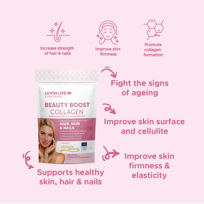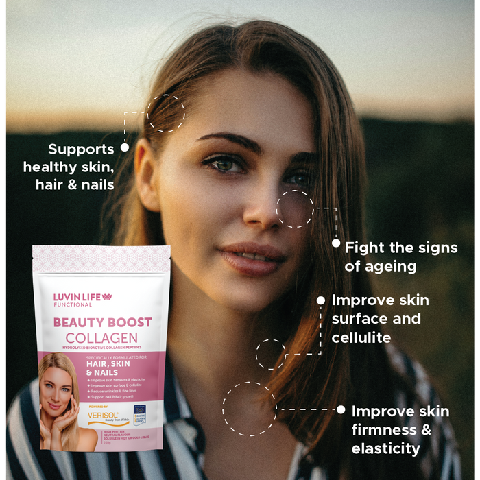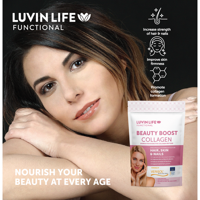 Beauty from within! Counteract the signs of aging, improve skin firmness and elasticity, reduce wrinkles and fines and improve skin surface and cellulite with Luvin Life Beauty Boost Collagen.
