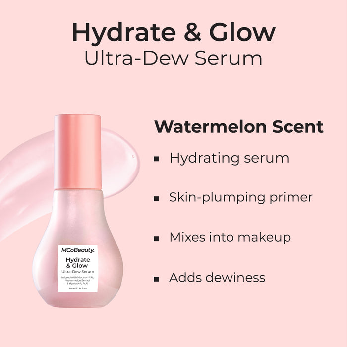 MCoBeauty HYDRATE & GLOW ULTRA_DEW SERUM is a 3-in-1 skincare-makeup infusion to instantly enhance a radiant looking complexion. The lightweight, non-sticky gel-serum seamlessly absorbs into skin for a lit-from-within dewy finish without any shimmer or mica. Infused with skin-loving ingredients, including Niacinamide to refine skin texture, even out skin tone, and minimise the appearance of blemishes, plus Watermelon Extract & Hyaluronic Acid to brighten skin and keep it looking plump, hydrated and bouncy. Use this versatile serum alone, as part of your skincare routine, or as a primer before makeup. You can even mix it with your favourite skincare or makeup products for a customisable, glassy skin glow. Designed for normal to dry skin, instantly elevates instantly elevate your daily beauty routine with this luxuriously hydrating serum, enhanced with a delicious, skin quenching watermelon scent.