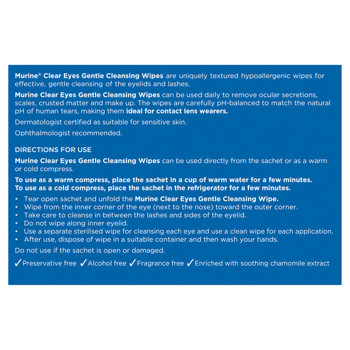 MURINE® Clear eyes Gentle Cleansing Wipes are uniquely textured hypoallergenic wipes for effective, gentle cleansing of eyelids and eye lashes. MURINE® Clear eyes Gentle Cleansing Wipes can be used daily to remove ocular secretions, scales, crusted matter and make up. The wipes are carefully pH-balanced to match the natural pH of human tears, making them ideal for contact lense wearers.