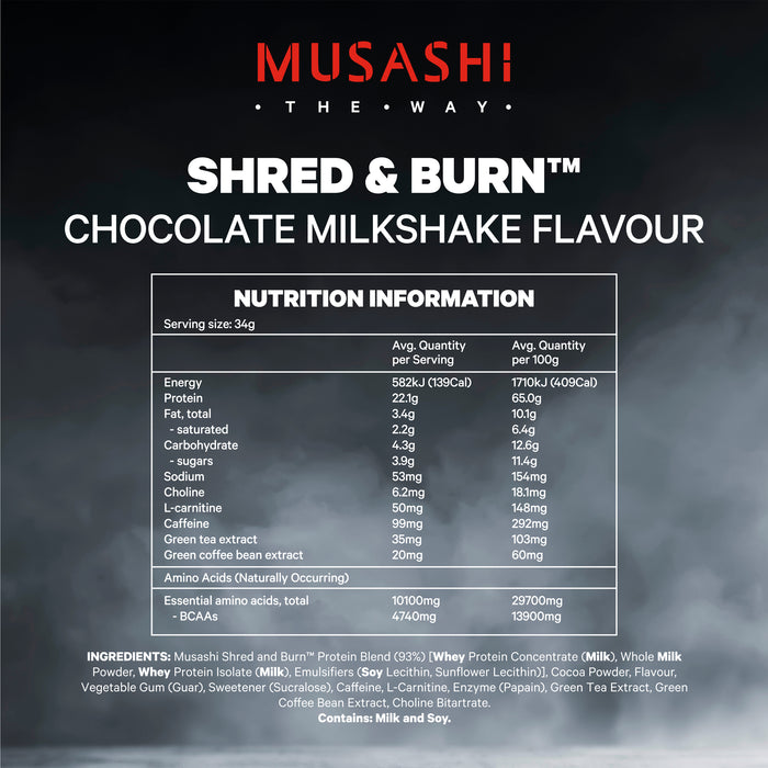 Musashi Shred and Burn™ Protein Blend (97%) [Whey Protein Concentrate, Whole Milk Powder, Whey Protein Isolate, Emulsifiers (Soy Lecithin, Sunflower Lecithin)], Flavours, Vegetable Gum (Guar Gum), Caffeine, L-Carnitine, Enzyme (Papain), Sweetener (Sucralose), Green Tea Extract, Green Coffee Extract, Choline Bitartrate.