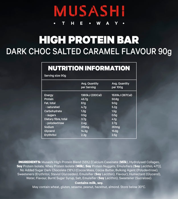 MUSASHI HIGH PROTEIN bar packs 45g of protein with less than 2g of carbs in a convenient, delicious dark chocolate coated bar with a salted caramel flavoured centre. Great for when you need your protein hit post-workout, or as a powerful nutritious snack on-the-go.