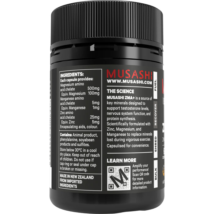Musashi ZMA+ is a key source of minerals designed to support testosterone levels, nervous system function, and protein synthesis. Scientifically formulated with zinc, magnesium, and manganese to replace minerals lost during vigorous exercise.