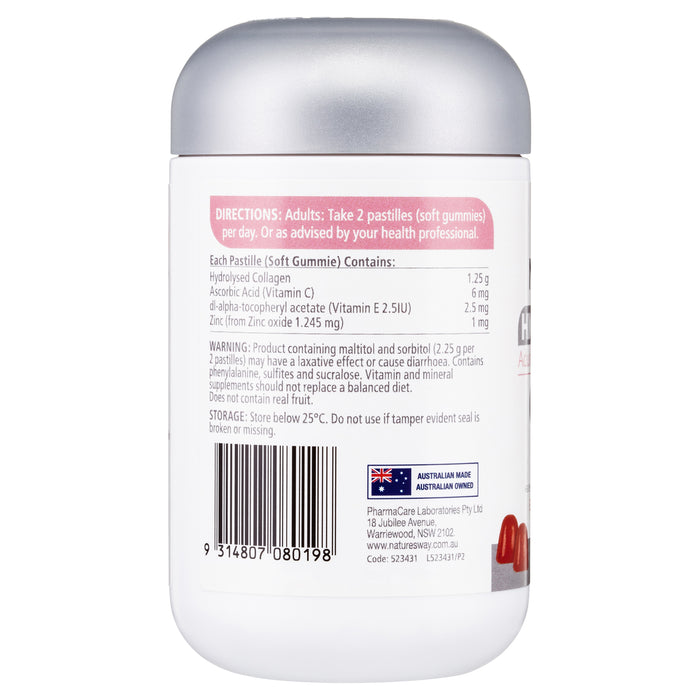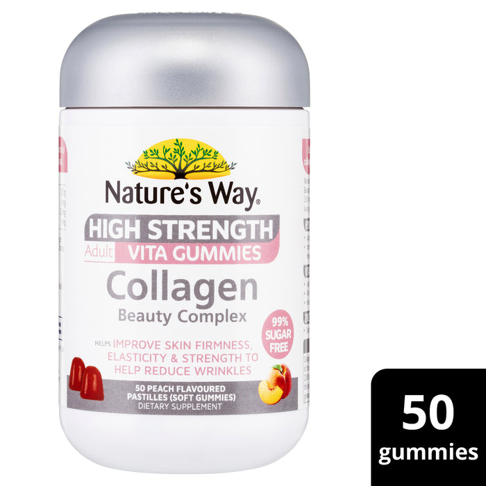 Nature's Way High Strength Adult Vita Gummies Collagen Beauty Complex is a high strength supplement formulated with 2500 mg of hydrolysed collagen per dose to support radiant, glowing and nourished skin.