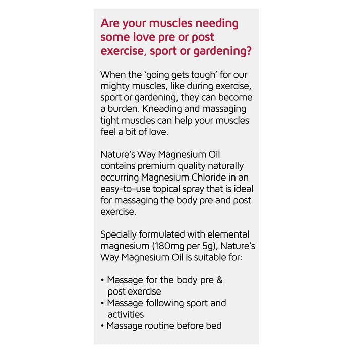 With elemental magnesium (180mg per 5g), Nature’s Way Magnesium Oil is suitable for: