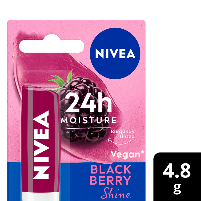 Care for your lips with NIVEA Lip Care Blackberry Shine! The soft balm provides you with a delicious blackberry aroma and a subtle bordeaux shine. The unique formula enriched instantly melts into your lips and keeps them moisturised for 24 hours*. It glides on evenly and easily so that no mirror is required! For a beautiful touch of shiny color and soft, kissable lips; all day, every day. Stay protected and hydrated effortlessly, all day, with NIVEA Blackberry Shine. The skin compatibility of this caring lip balm has been dermatologically approved. *clinically tested.