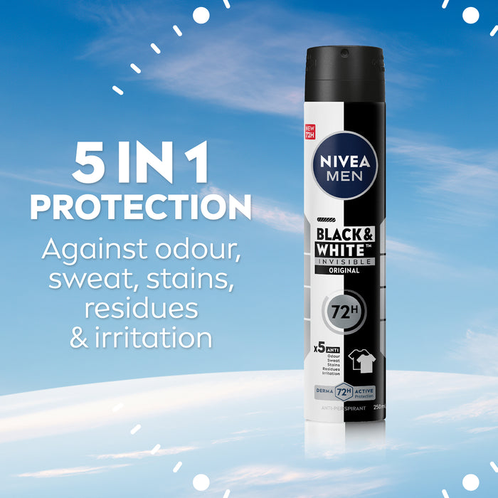 NIVEA MEN BLACK & WHITE INIVISIBLE range offers powerful anti-perspirant protection without the risks of white marks on black clothing and yellow stains on white clothing. By using anti-stain technology, NIVEA MEN BLACK & WHITE is able to protect the textile fibres before stain components can reach and penetrate them. The unique formula protects you for 72 hours against sweat, odors, stains, residues and irritations, while being gentle on the skin. Say Goodbye to white and yellow stains on your clothes The formulas skin tolerance are dermatologically proven and do not contain ethyl alcohol. Our anti-perspirants offer Derma 72h Active protection: our products are working with the skin, for reliable and strong efficacy against sweat and odour and with kind-to-skin formulations. Get the reliable protection and care that you deserve! Also available in a roll-on format.