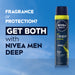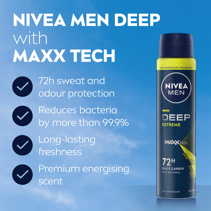 NIVEA MEN DEEP Extreme Anti-Perspirant protects your skin from sweat and bacteria for a long-lasting dryness and a clean skin feel. The designed MAXXTECH formula with black carbon leaves no black residue and provides a long-lasting energising fragrance.. The NIVEA MEN DEEP Extreme Anti-Perspirant offers reliable 72 hour anti-perspirant, sweat and odour protection before, during and after sport, with a freshness boost. The antibacterial formula reduces bacteria by more the 99.9%, providing skin active protection. Get the reliable protection and care that you deserve! The skin tolerance of this anti-perspirant has been dermatologically proven.