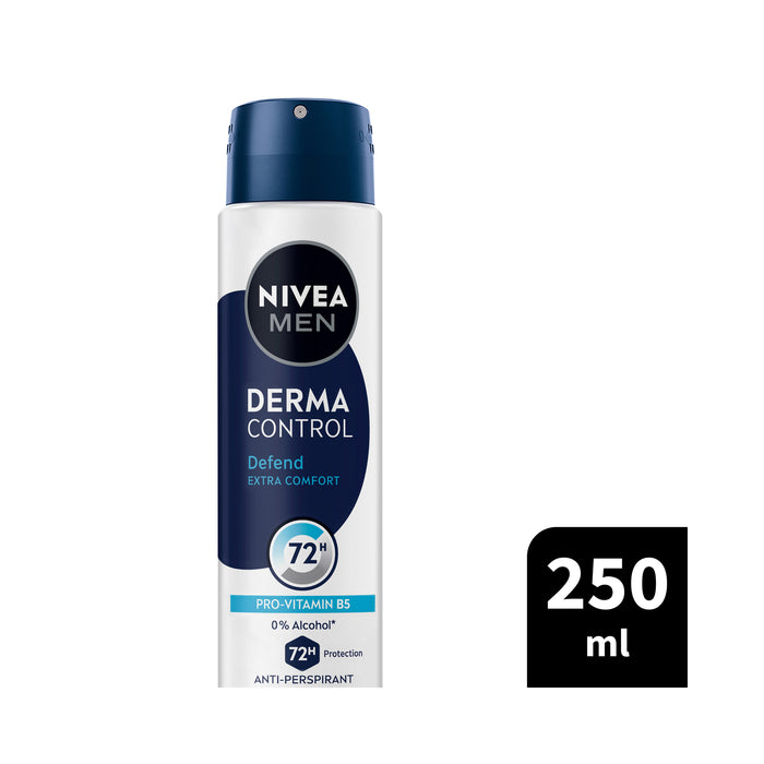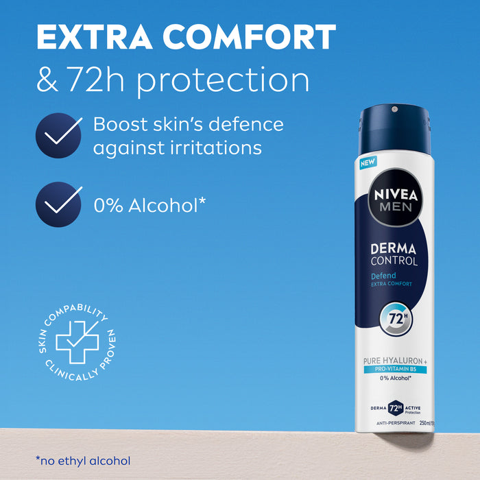 NIVEA MEN DERMA CONTROL Defend provides extra comfort feeling with reliable 72H anti-perspirant protection. Advanced Formula with Pure Hyaluron and Pro-vitamin B5, it strengthens the skin's barrier and defends against itchiness, while nourishing the skin. For healthy looking skin. The anti-perspirant range offers 72h protection: It's formula works with the skin for reliable and strong efficacy against sweat and odour, whilst caring for your underarms. All of our products are free of ethyl alcohol and their skin tolerance is dermatologically proven. Get the reliable protection and care that you deserve! Also available in a roll-on format.