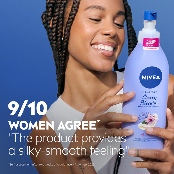 NIVEA Oil in Lotion Cherry Blossom & Jojoba Oil has been developed with your normal to dry skin in mind. The new and improved formula with precious Jojoba Oil has been carefully blended into a fast-absorbing lotion. Awaken your senses with a delicate cherry blossom scent and deeply moisturise your skin without greasy residue. This oil in lotion smoothes your skin, leaving it nourished and moisturised for over 48 hours. The ingredients for this lotion have been carefully selected according to strict quality standards – the skin compatibility has been dermatologically approved. This product comes in a practical pump bottle for easy usage. NIVEA cares for your skin and planet. New improved bottle with reduced plastic vs. before / 50% recycled plastic bottle (without pump). Ingredient listings for our products might change over time with new innovations. Whilst we try to update this as quickly as we can, it’s best to check the ingredients on your packaging to ensure it’s suitable for your needs.