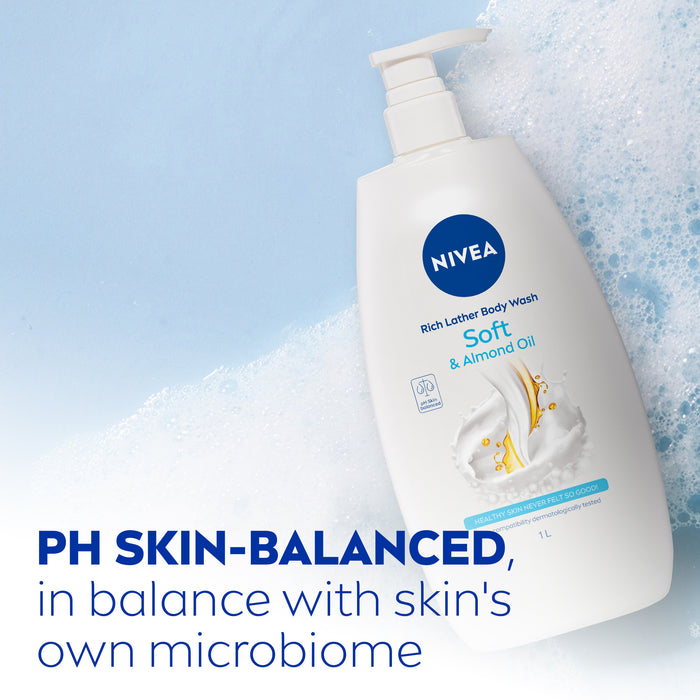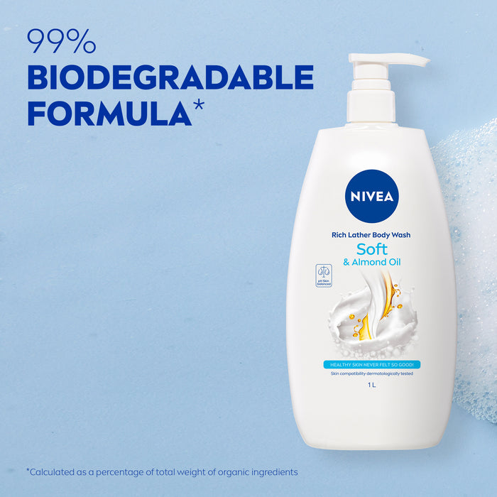 NIVEA Rich Moisture Soft Shower Gel and Body Wash with Almond Oil transforms to a soft lather, leaving your skin feeling silky and moisturised. Let this caring shower cream with almond oil nourish your skin with a rich lather, while its mild scent delights your senses. The shower cream leaves skin feeling soft and moisturised, even after towel drying. Skin compatibility dermatologically approved. NIVEA Rich Moisture Soft Shower Gel and Body Wash with Almond Oil is pH skin-balanced so it is suitable for all skin types for everyday usage. Enjoy the ultimate indulging me-moment, every day - simply apply to your wet skin and massage it onto your whole body before rinsing it off. The formula is 99% biodegradable as per OECD or equivalent methods.