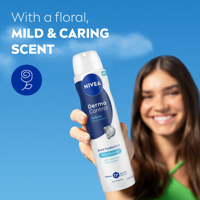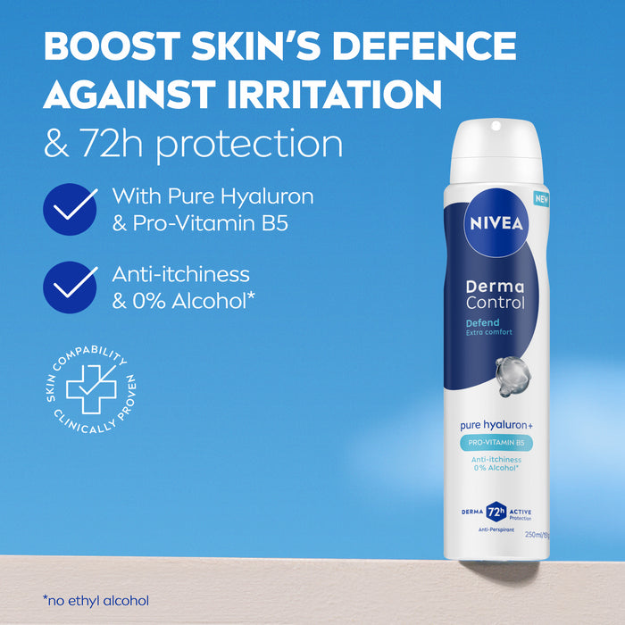 NIVEA DERMA CONTROL Defend range works against itchiness whilst providing extra comfort for your underarms. It's formula with Pure Hyaluron and Pro-Vitamin B5 effectively defends your skin against irritations, whilst nourishing the underarm skin. For softer and beautiful underarms with a healthy skin feeling. The anti-perspirant range offers 72h protection: It's formula works with the skin for reliable and strong efficacy against sweat and odour, whilst caring for your underarms. All of our products are free of ethyl alcohol and their skin tolerance is dermatologically proven. Get the reliable protection and care that you deserve! Also available in a roll-on format.