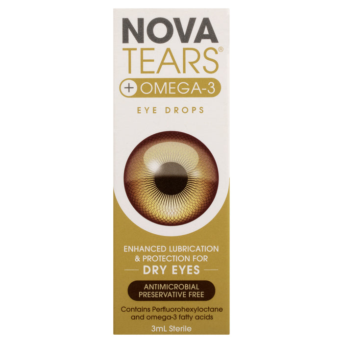 NovaTears® + Omega-3 helps provide enhanced lubrication and protection for dry and irritated eyes, by stabilising the lipid layer of the tear film, preventing evaporation of the tears, and restoring and increasing lipid layer thickness.