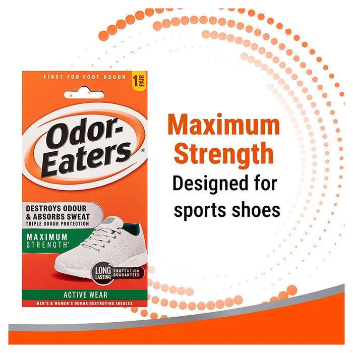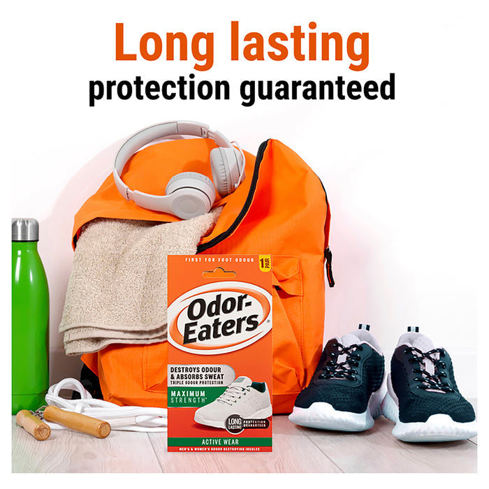 Odor-Eaters Active Wear Insoles are specially designed for sneakers and sports shoes. Now your sneakers can stay fresh and comfortable no matter how active you are.Odor-Eaters Active Wear insoles contains activated charcoal to lock in and destroy odour, Insta-Fresh® to instantly neutralise sweat acids that release odour and a powerful anti-bacterial agent to fight odour-causing bacteria, providing odour and wetness control that lasts for months.