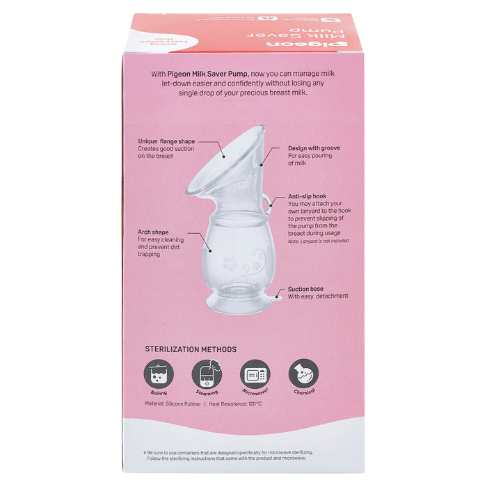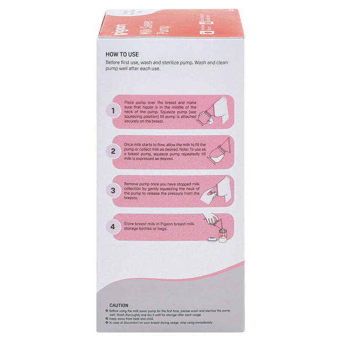 Place Pigeon milk saver pump over the breast and make sure that nipple is in the middle of the neck of the pump. Squeeze pump till pump is attached securely on the breast. Once milk starts to flow, allow the milk to fill the pump or collect milk as desired. Remove pump once you have stopped milk collection or pump is full by squeezing flange area. Store breast milk in PIGEON breast milk storage bottles or bags.