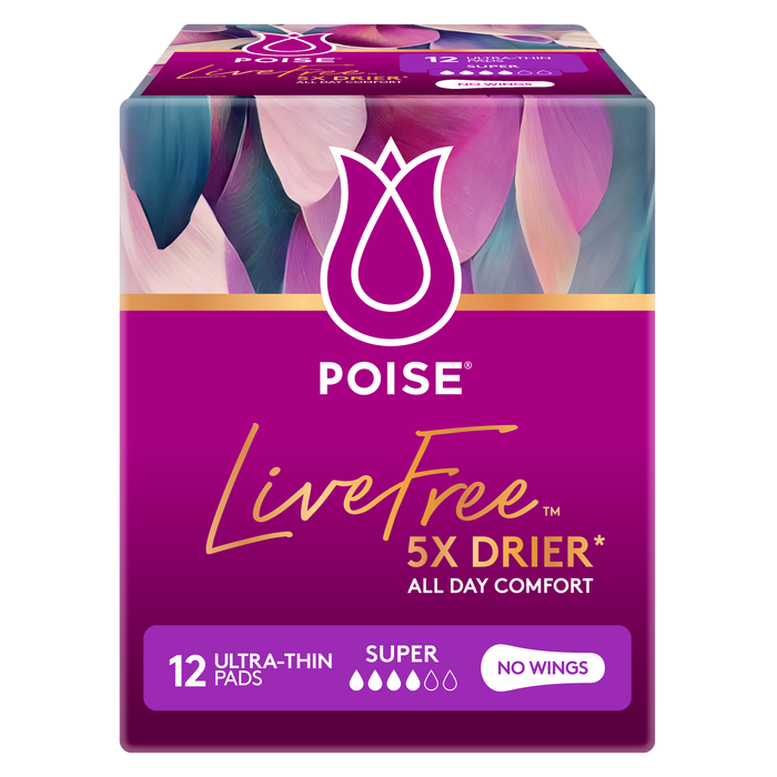 - Poise LiveFree Pads are 5 times drier than leading period pads, offering superior dryness and comfort.