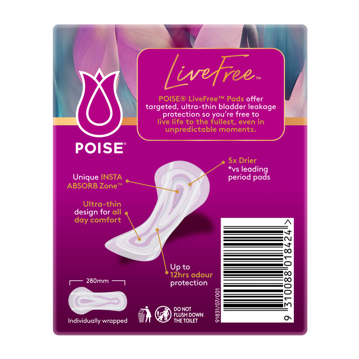 Experience the freedom to live life to the fullest with Poise LiveFree Pads. These pads offer targeted, ultra-thin bladder leakage protection, ensuring you stay confident and comfortable, even in unpredictable moments.