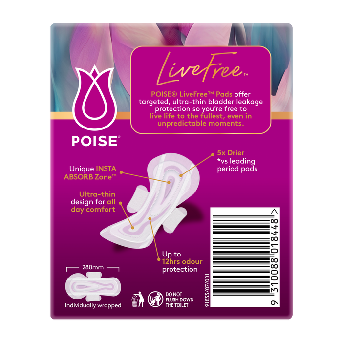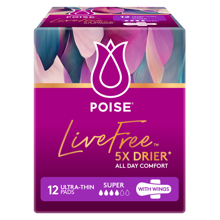 - Poise LiveFree Pads are 5 times drier than leading period pads, offering superior dryness and comfort.