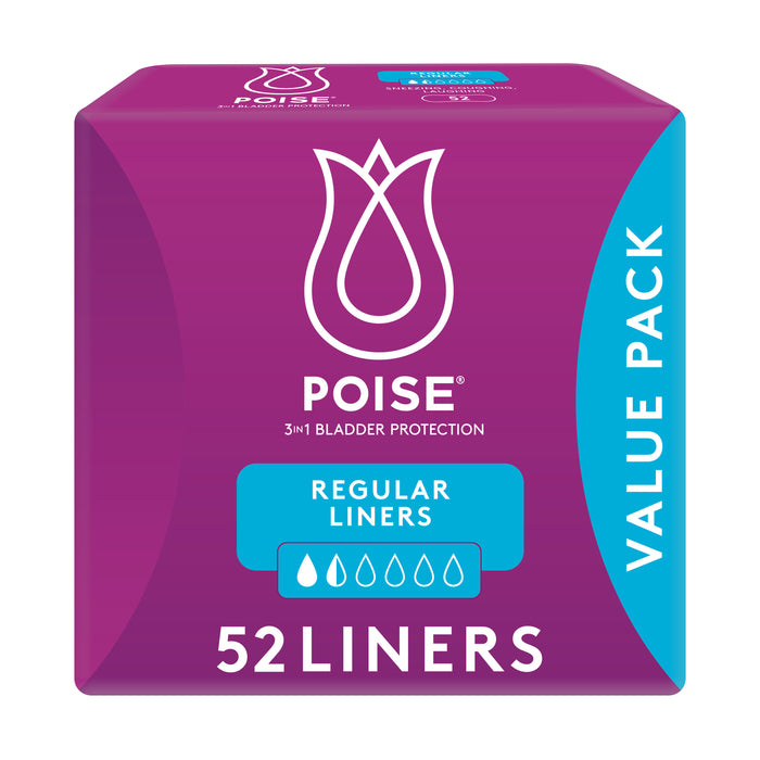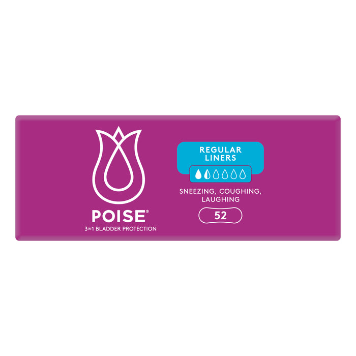 Poise Regular Liners for Bladder Leaks offer discreet protection against light bladder leakage. Providing additional coverage to period liners, they absorb bladder leaks commonly experienced when sneezing, coughing or laughing. Experience Poise 3 in 1 Bladder Protection to enjoy comfort, dryness and odour control. You've got Poise to keep you feeling feminine, confident and in control.