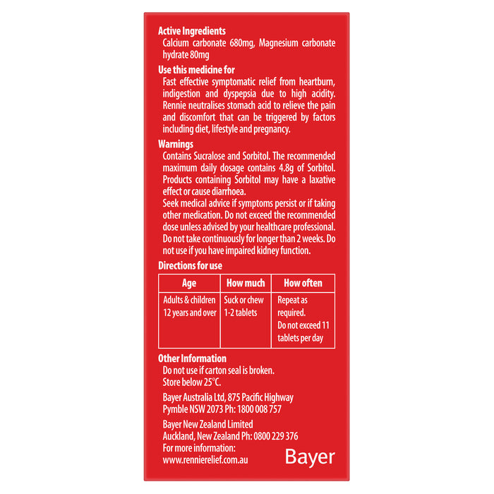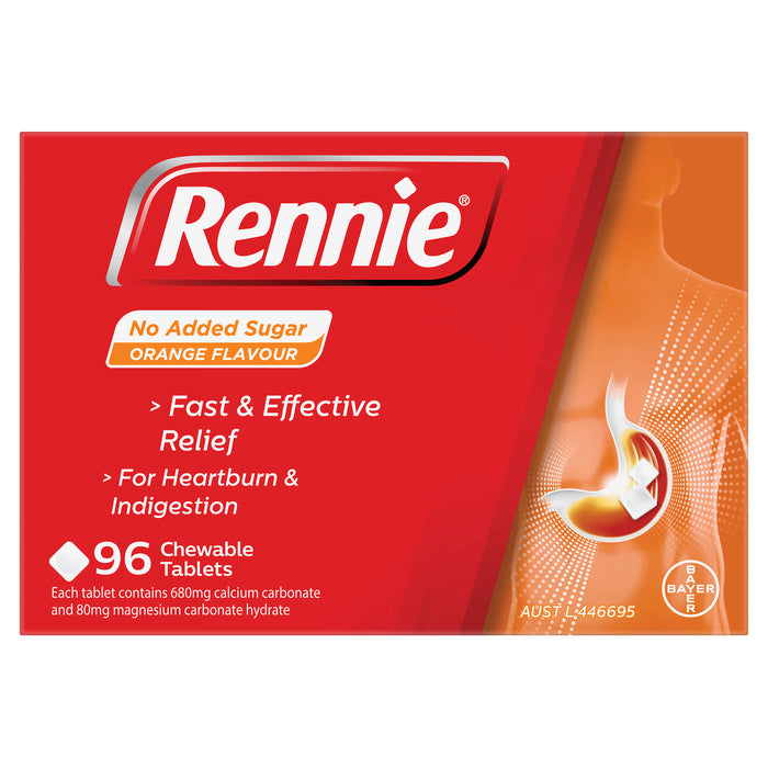 Rennie® No Added Sugar tablets contain two antacids called calcium carbonate and magnesium carbonate which neutralise excess stomach acid by turning it into water & other natural substances. Rennie is an antacid that provides fast relief from indigestion, heartburn, acidity and dyspepsia.
