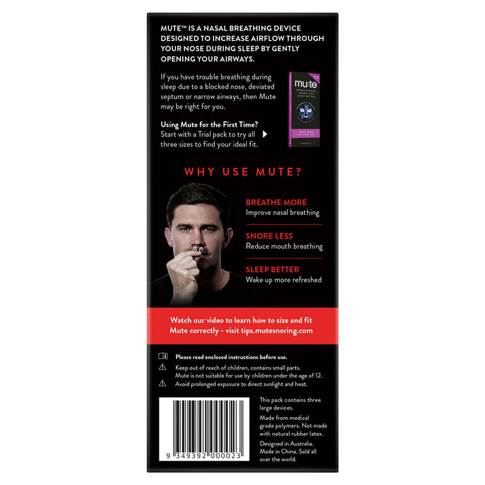 How do I know my size? Every nose is different. Which is why we make three different sizes of Mute. To find your right size purchase the Mute Starter Pack which contains a small, medium and a large Mute. This enables you to try each one and find your perfect fit. Mute is also fully adjustable so you can alter the amount of dilation to suit each nostril and get the right balance of comfort and airflow.