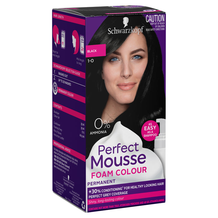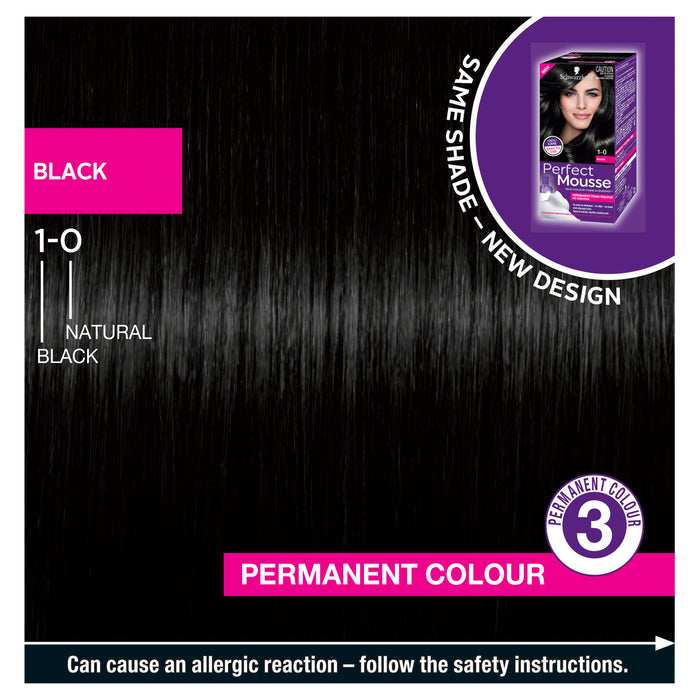 Schwarzkopf Perfect Mousse Permanent Foam Colour 1.0 Black is an anti-damage foam which provides natural results for healthy looking hair, contains no ammonia, and is as easy as shampoo - no drip - no mess!