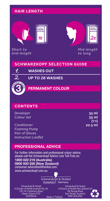 1 Application bottle with developer emulsion 35mL, 1 Bottle colour gel 35mL, 1 Sachet repair conditioner 22.5mL, 1 Foaming pump, 1 Instruction leaflet, 1 Pair of gloves.