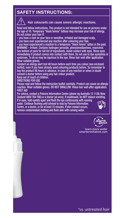 Hair colourants can cause severe allergic reactions. Read and follow instructions. This product is not intended for use on persons under the age of 16. Temporary "black henna" tattoos may increase your risk of allergy. Do not colour you hair if: - you have a rash on your face or sensitive, irritated and damaged scalp. - you have ever experienced any reaction after colouring your hair. - you have experienced a reaction to a temporary "black henna" tattoo in the past.
