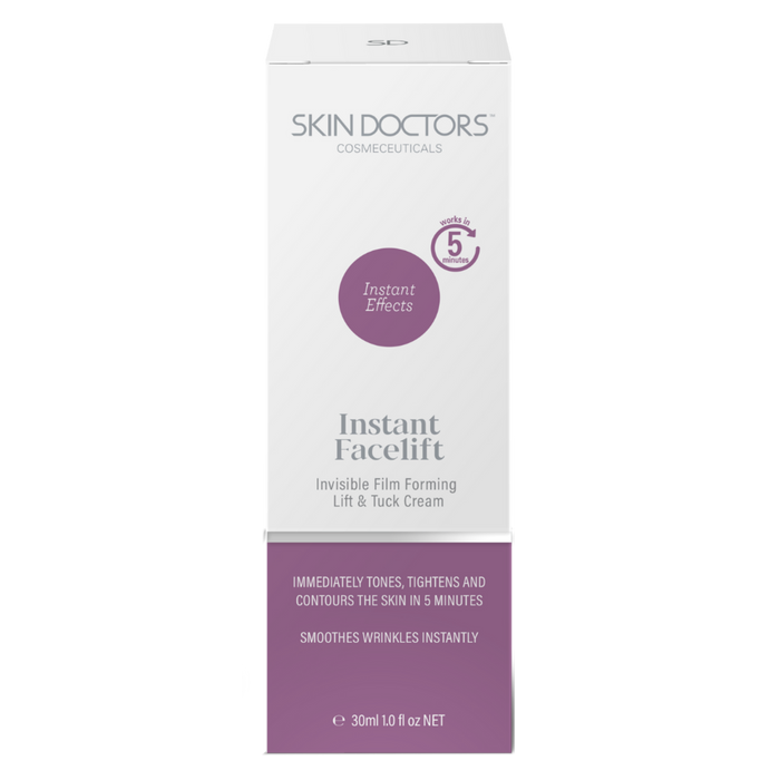 Skin Doctors™ Instant Facelift is a non‑surgical, film‑forming serum that visibly tightens, lifts and firms skin in just about five minutes, with effects lasting up to eight hours.