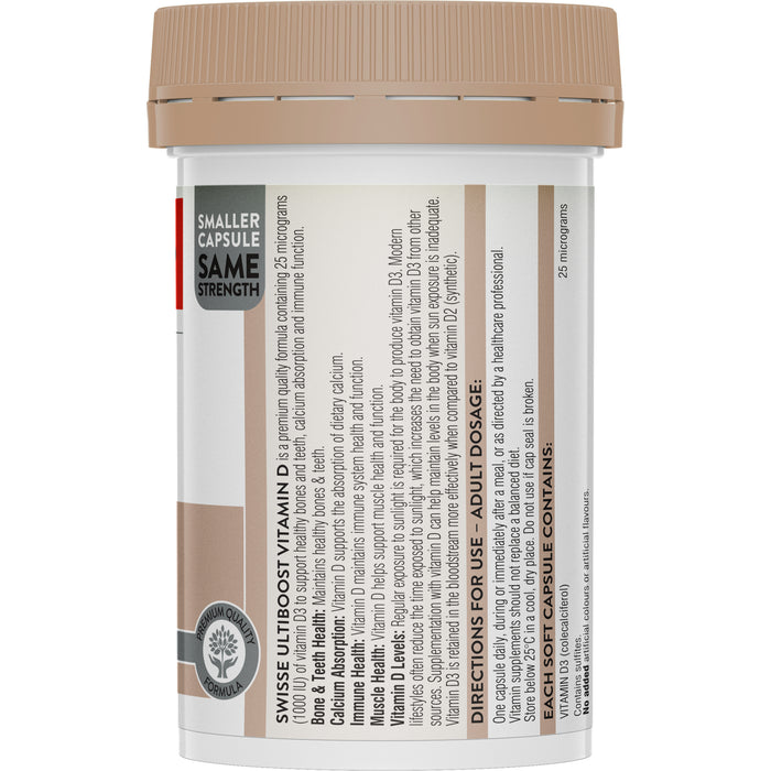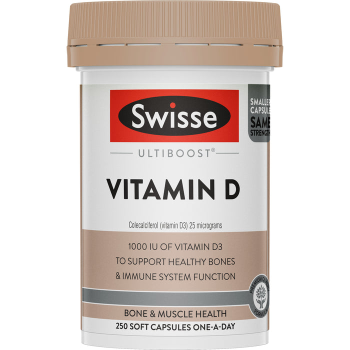 Swisse Ultiboost Vitamin D is a premium quality formula that maintains healthy bones and teeth, bone density supports the absorption of dietary calcium, and maintains immune system health and function. Vitamin D is produced by the body when it’s exposed to sunlight, however inadequate sun exposure can sometimes mean our body’s vitamin D levels are low – in fact, nearly one quarter of Australian adults are deficient in vitamin D*. This supplement contains 25 micrograms of vitamin D3, which is retained in the bloodstream more effectively when compared to vitamin D2 (a synthetic form).