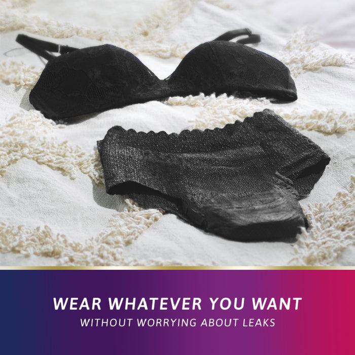 Elegant, discreet incontinence underwear for women, with an all-black lingerie look.