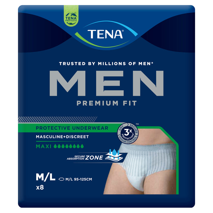 TENA Men Premium Fit Protective Underwear Maxi Medium/Large for men feels like regular underwear, with a masculine cut and striped design, elastic waistband, and a breathable cotton-like feel.