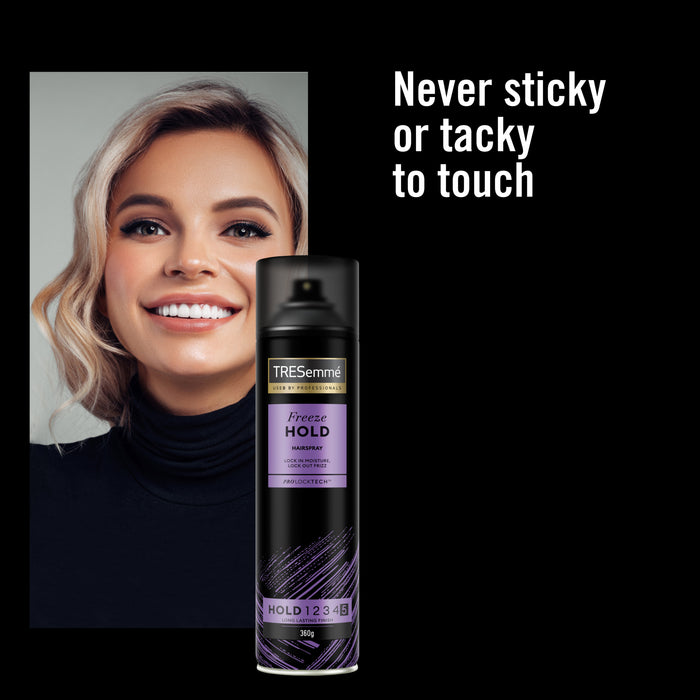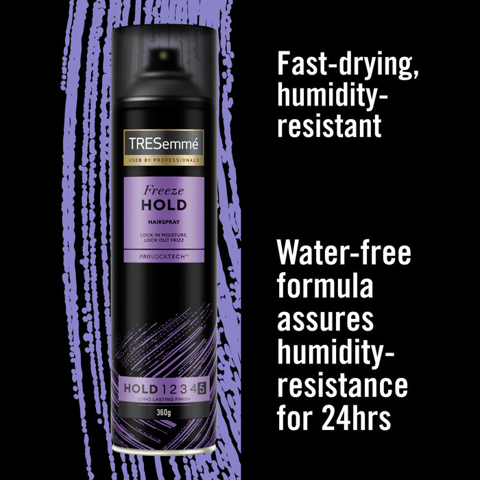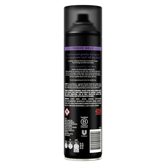 With a hold level of 5 out of 5, TRESemme Freeze Hold Hairspray fully secures your look in a flash while leaving no sticky residue. Its fast-drying, water-free formula assures humidity resistance for 24 hours, helping you achieve a style that stays in place all day. Whether you’re opting for a straight, curly or wavy look, or you’re looking to ensure your updos won’t fall flat, this styling spray provides a long-lasting finish without stiffness, so hair still feels flexible. For best results, prep your hair with your favourite TRESemme shampoo and conditioner. To apply TRESemme Extra Hold Hairspray, shake the can thoroughly before spraying evenly on dry hair from 20 to 30 cm away, one section at a time. For a stronger hold, layer more coats just where you want more control. For the ultimate body and fullness, flip your hair upside down and spray all over to set. Since our salon beginnings in 1948, TRESemme has been creating professional-quality hair care products to help you achieve the look and style you want, every time. TRESemme understands how great hair gives you the confidence to walk taller every day. Inspired by stylists and tested in salons, our products are designed to help you achieve salon-gorgeous hair every day. These are salon-quality formulas without the salon price tag. TRESemme does not test on animals and is PETA approved worldwide. To learn more about the range or access stylist tips and tricks, go to our website.