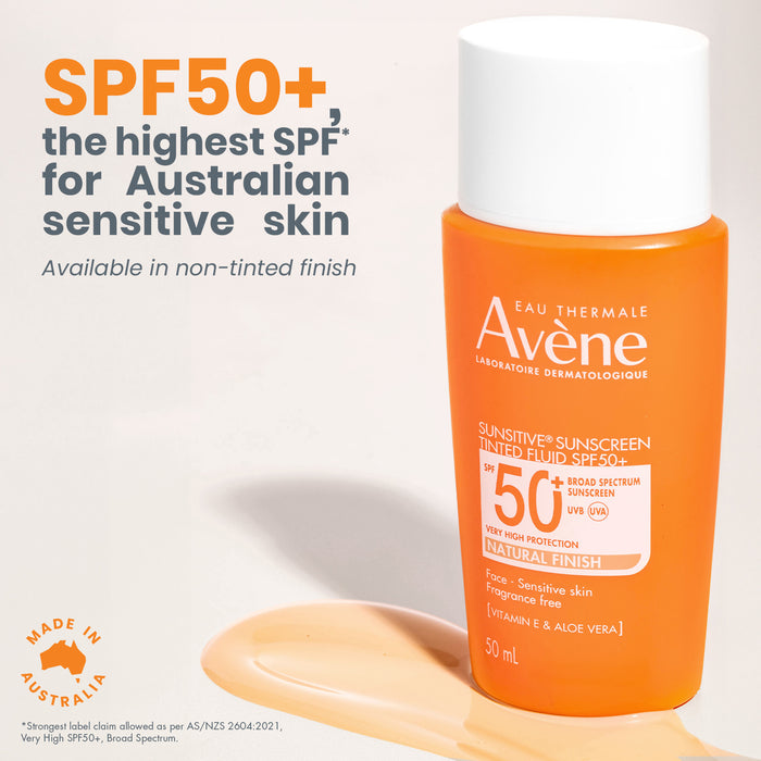 Avène Sunsitive® Sunscreen Tinted Fluid SPF 50+ is a lightweight sunscreen for the face that unifies the complexion. Specifically made in Australia, against the harsh Australian sun, this tinted sunscreen is suitable for sensitive skin and provides a very high broad spectrum UVB-UVA protection.
