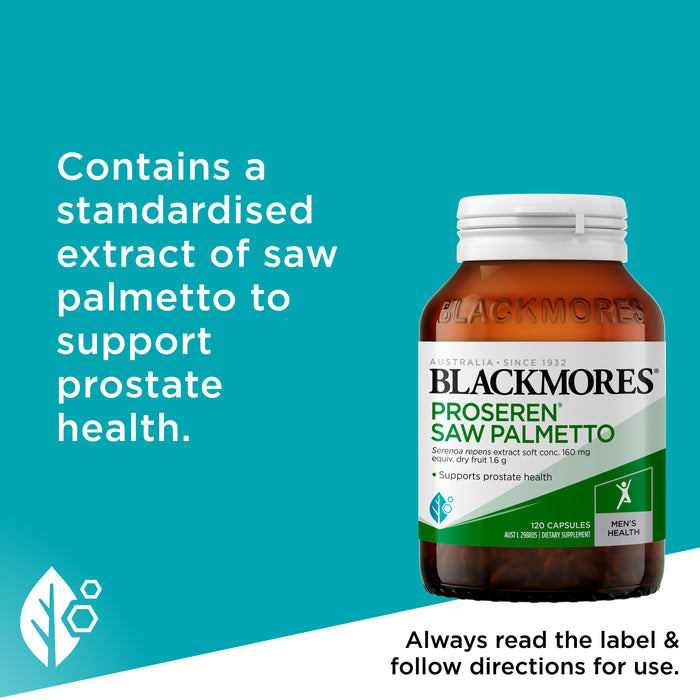 Help support the health of your prostate with Blackmores Proseren Saw Palmetto capsules. These men’s health supplements also support male urinary tract health. The formula contains a standardised extract of the herb serenoa, commonly known as saw palmetto. This herbal plant is used in traditional medicine to support prostate health and function. Adults: Take one capsule a day with food.