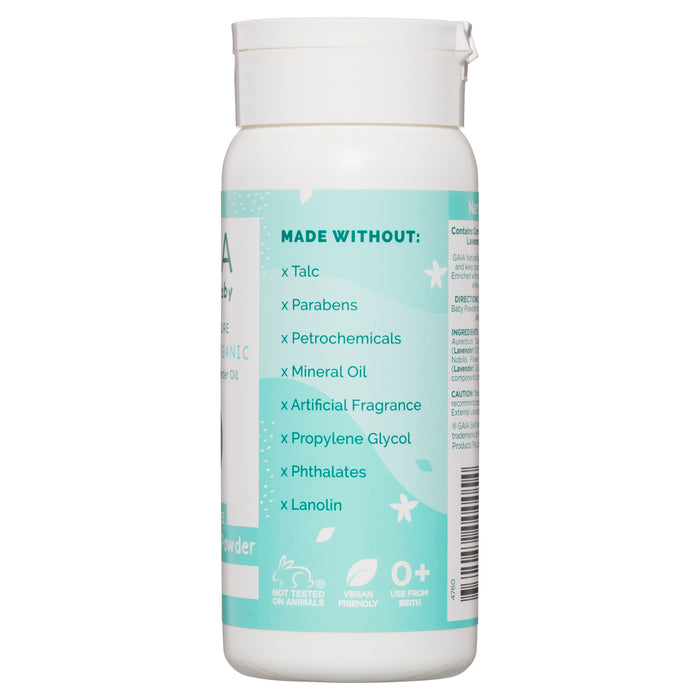 GAIA Natural Baby Powder contains Cornstarch helps to absorb excess moisture and keep your baby's bottom, and skin folds fresh and dry. Contains organic lavender to soothe and calm skin.