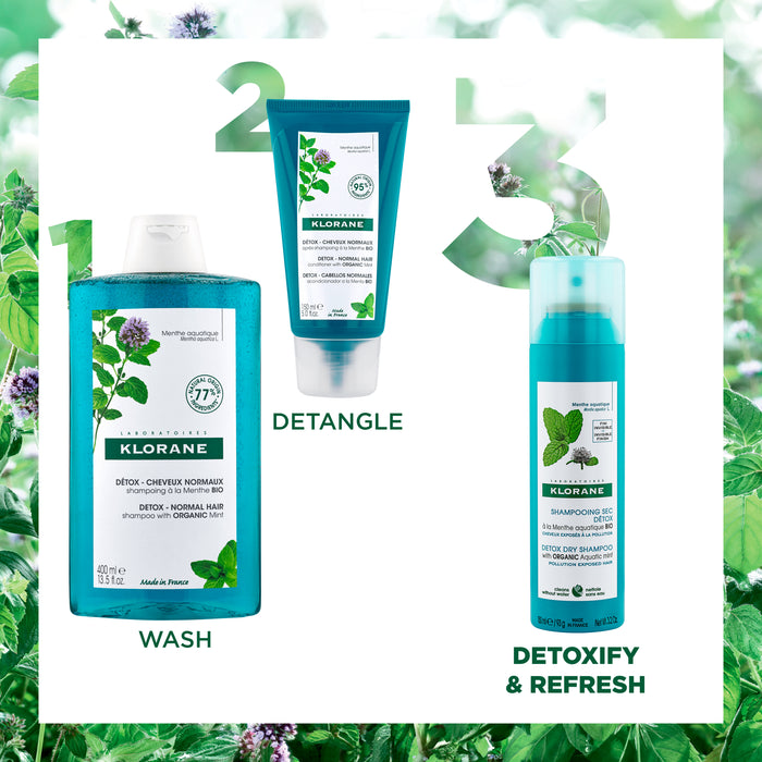 Klorane Detox Dry Shampoo with Aquatic mint instantly clarifies the hair and scalp without water in 2 minutes, while delivering an immediate cooling sensation and invisible finish for all hair types. Featuring 100% natural, organic Aquatic mint extract and natural absorbent micro-powders, this ultra-refreshing formula is clinically proven to remove impurities from the hair*.
