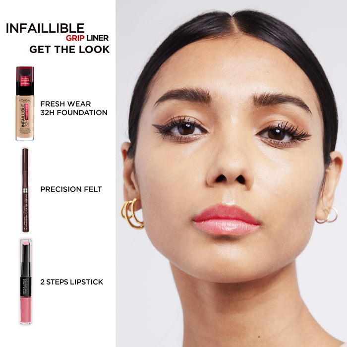 In one steady stroke, the L'Oreal Paris Infallible Grip Precision Felt liquid liner enhances your eye look with its 0.4mm precise tip. Providing bold and saturated strokes, this accurate, thin eyeliner guarantees maximum control thanks to its grip zone.